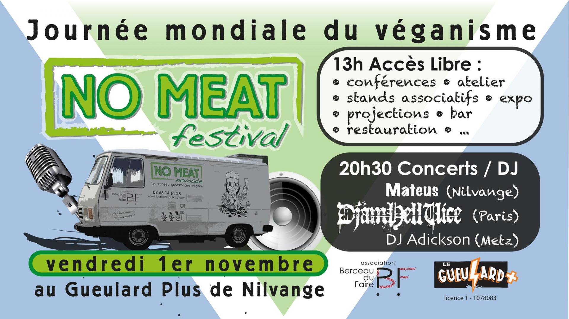Un an après la création de son food truck végane, le No Meat Nomade, l'association Berceau du Faire, en collaboration avec le Gueulard Plus, organise un festival afin de célébrer la journée mondiale du véganisme ! Alliant conférences, atelier de cuisine, exposition, stands associatifs, projections de film, de vidéos et concerts, le No Meat Festival aura lieu le 1er novembre 2019 de 13h à minuit au Gueulard Plus de Nilvange.